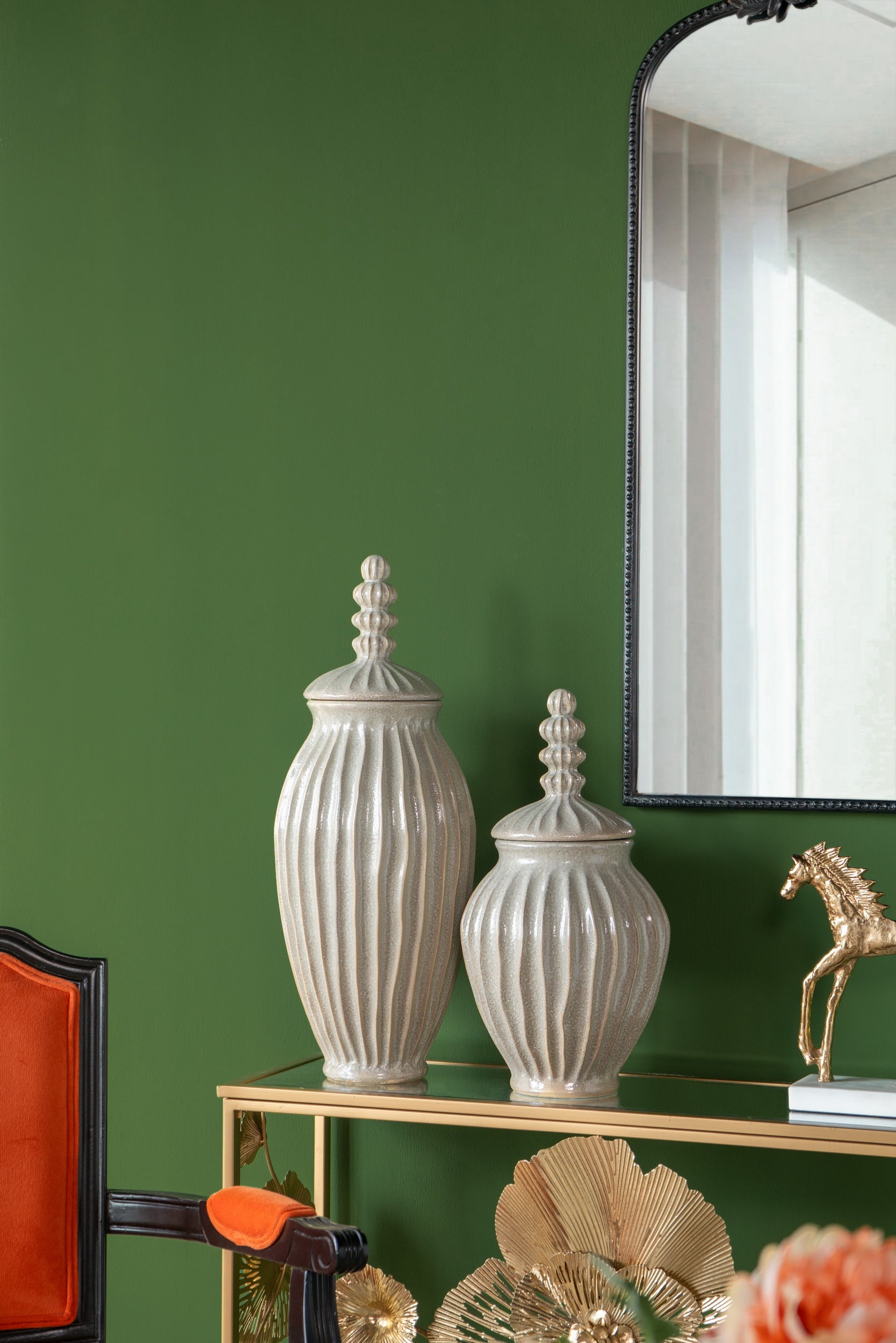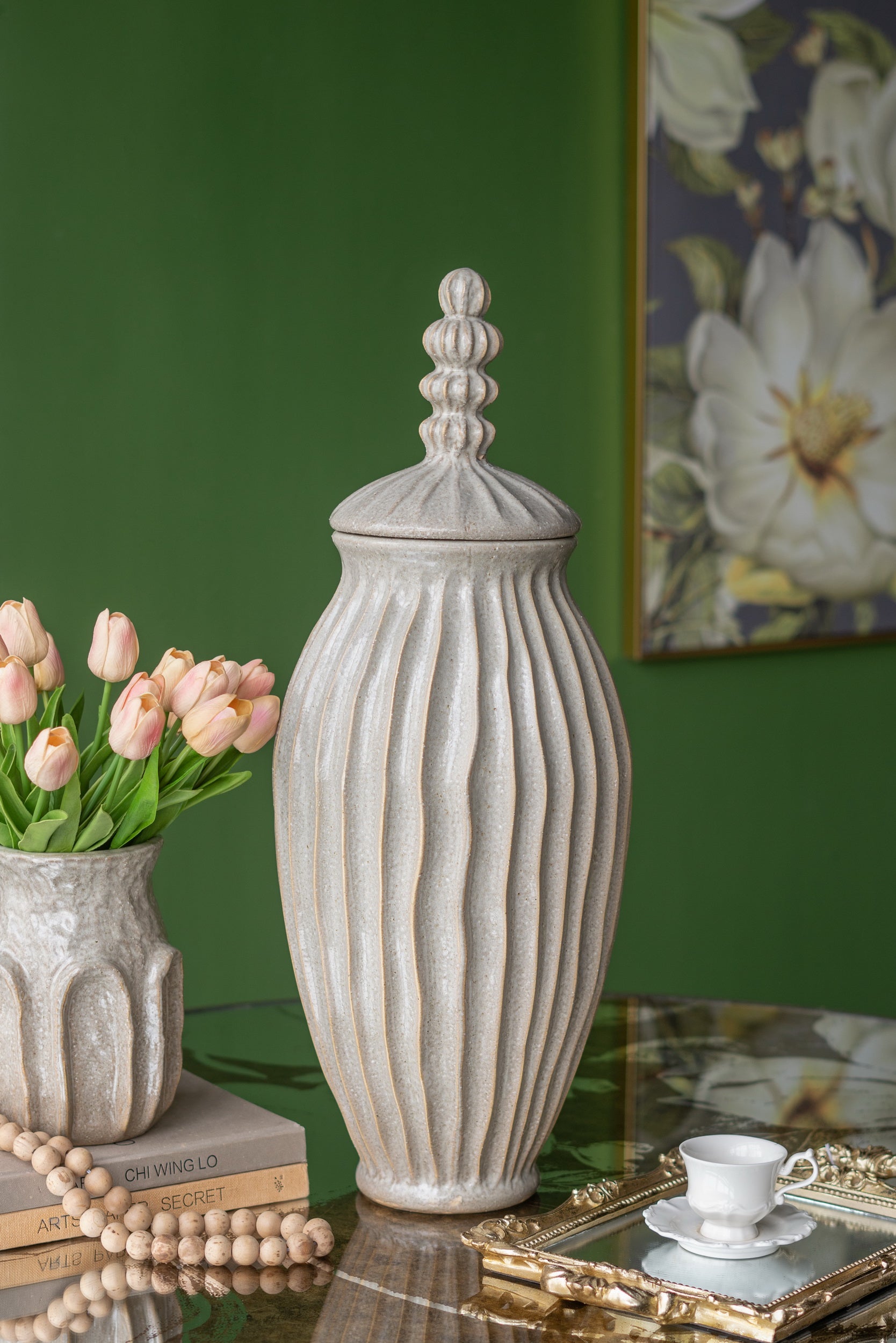 Introducing the Large Lara Jar, a beautifully crafted ceramic jar that not only adds a touch of elegance to your home decor, but also serves as a stunning storage solution for your most treasured items. Its smooth and sleek design evokes a sense of sophistication and refinement, making it the perfect addition to any luxurious setting.